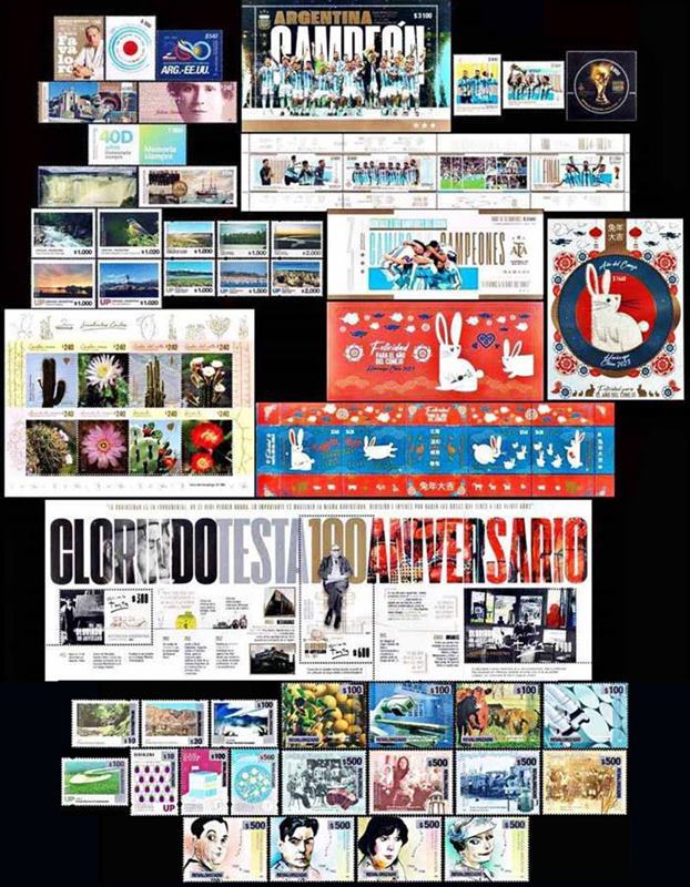 ARGENTINA – 2023 FULL YEAR – 11 COMMEMORATIVE STAMPS + 4 SOUV SHEETS + 5 DEFINITIVES + 5 UP STAMPS + 2 DEFINITIVE BOOKLETS + 19 REVALUED (15 DEFINITIVES AND 4 U.P.) – MINT