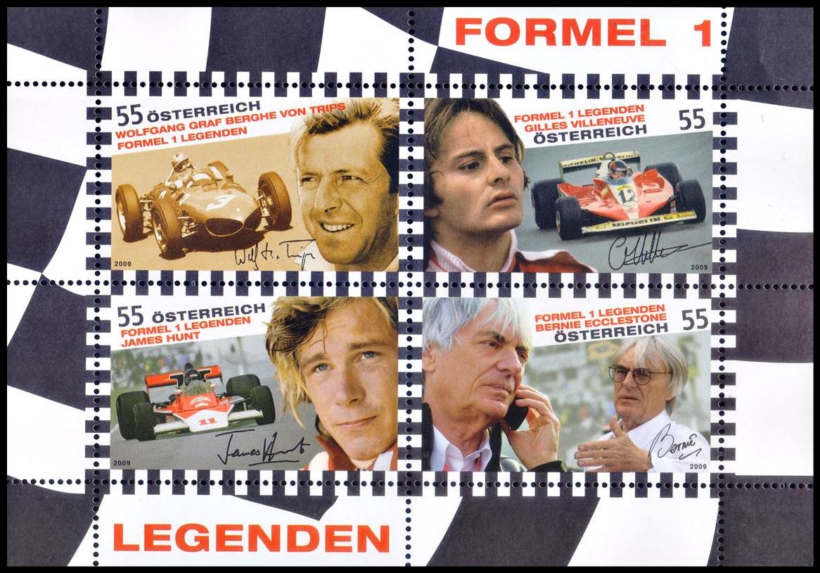 AUSTRIA/STAMPS, 2009 – LEGENDS – GREAT FORMULA 1 CHAMPIONS – YV 2637/40 – SHEET – MINT
