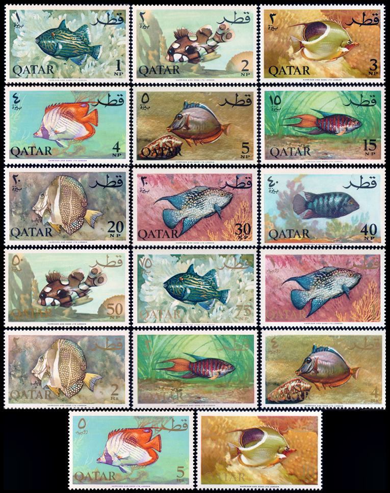 QATAR/STAMPS, 1965 – FISH OF THE PERSIAN GULF – AND 69/85 – SCOTT 69/85 – 17 VALUES – MNH