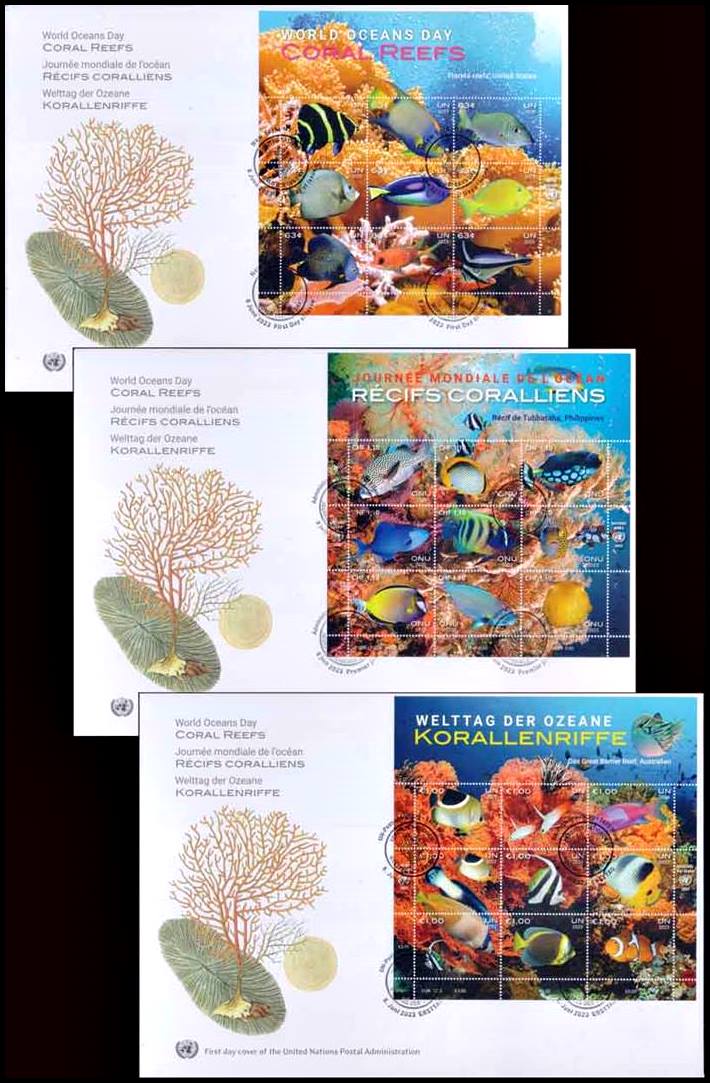UNITED NATIONS (UN) COVERS,  2023 - MARINE FAUNA - CORALS - FISH - 3  FIRST DAY COVERS
