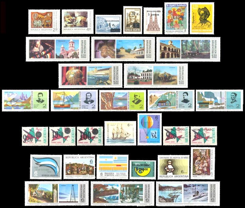 ARGENTINA – 1975 AÑO COMPLETO – 23 SELLOS CONMEMORATIVOS + 19 ORDINARIOS + 6 AEREOS – MINT