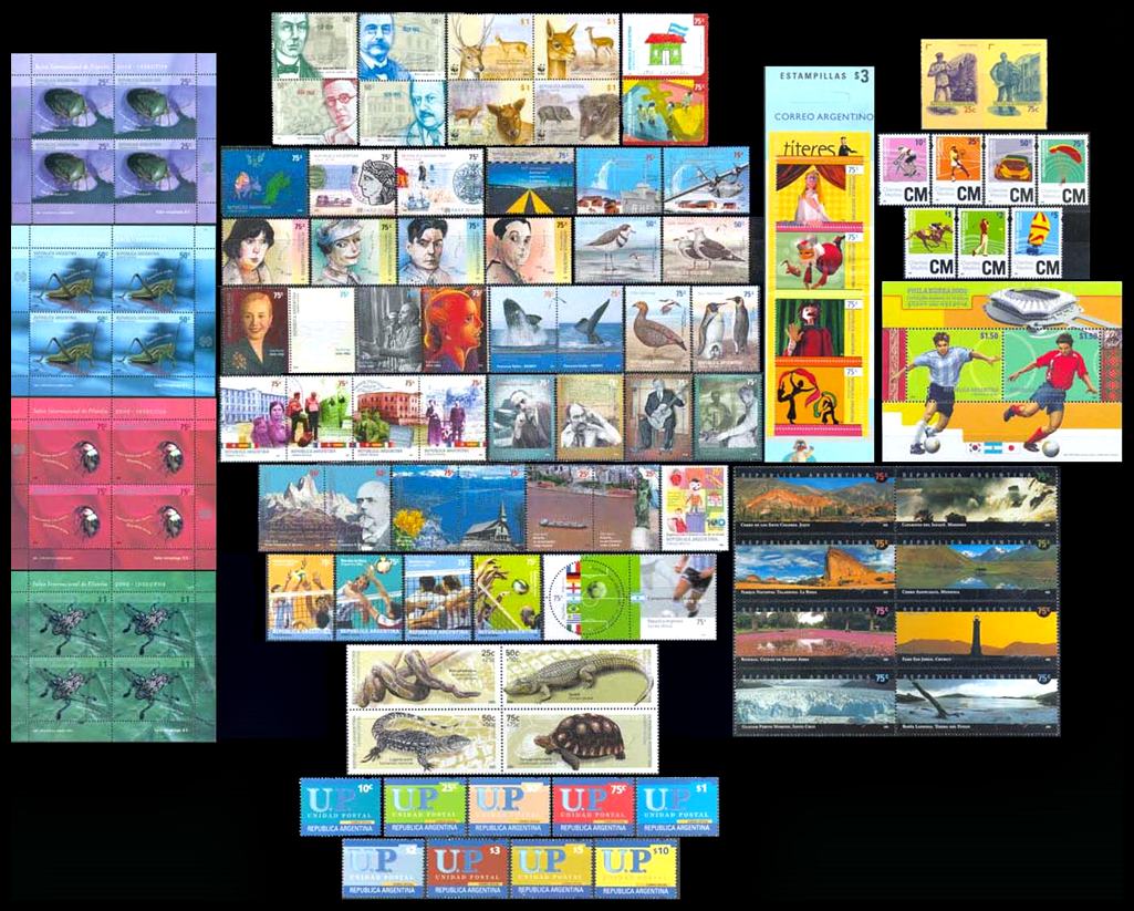 ARGENTINA – 2002 AÑO COMPLETO – 63 SELLOS COMEMORATIVOS + 13 ORDINARIOS + 9 SELLOS UP + 5 BLOQUE – mint