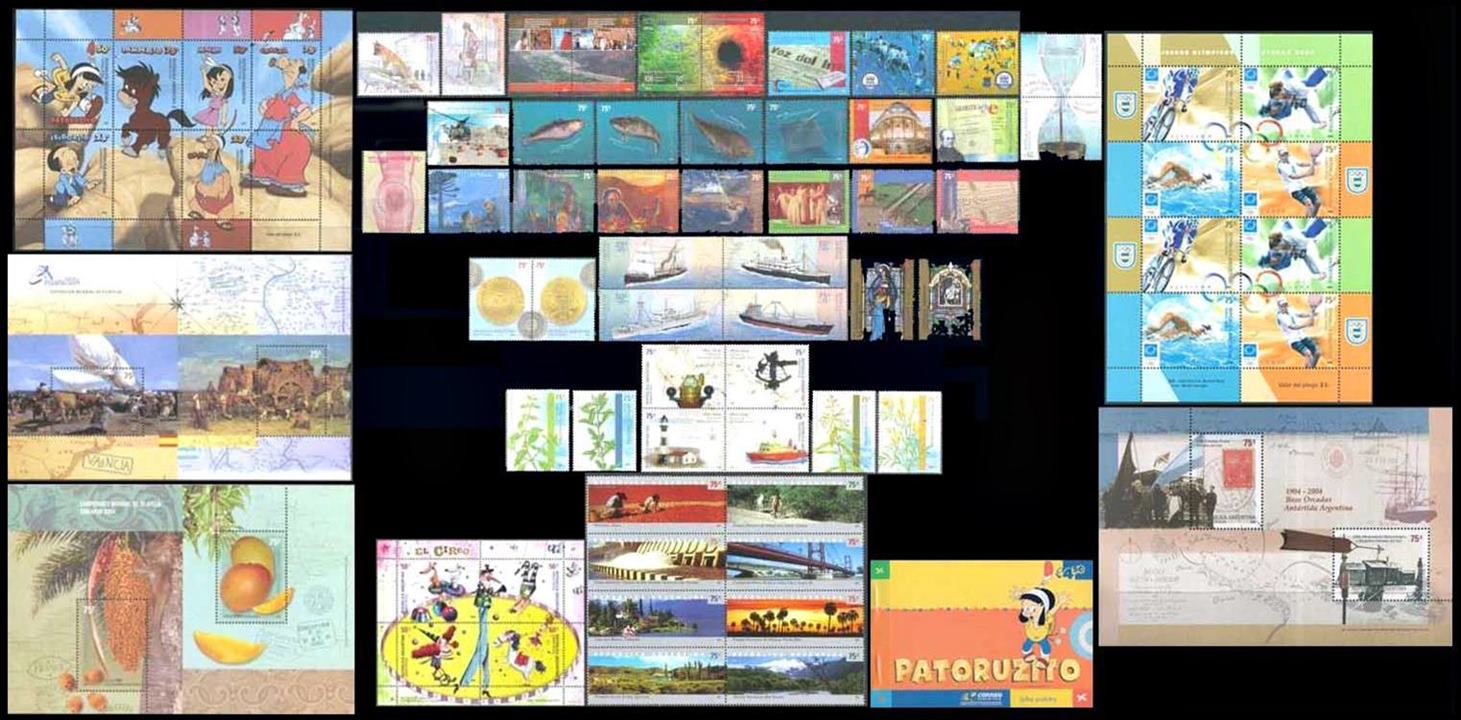 ARGENTINA – 2004 AÑO COMPLETO – 54 SELLOS CONMEMORATIVOS + 6 ORDINARIOS + 5 BLOQUES – MINT