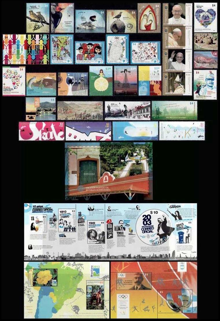 ARGENTINA – 2013 AÑO COMPLETO – 31 SELLOS CONMEMORATIVOS + 4 BLOQUES + 2 SELLOS DE U.P. – MINT