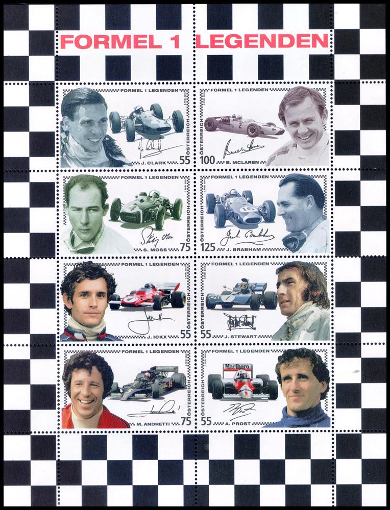 AUSTRIA/SELLOS, 2006 – LEYENDAS – GRANDES CAMPEONES DE FORMULA 1 – YV 2419/26 – HOJITA – MINT
