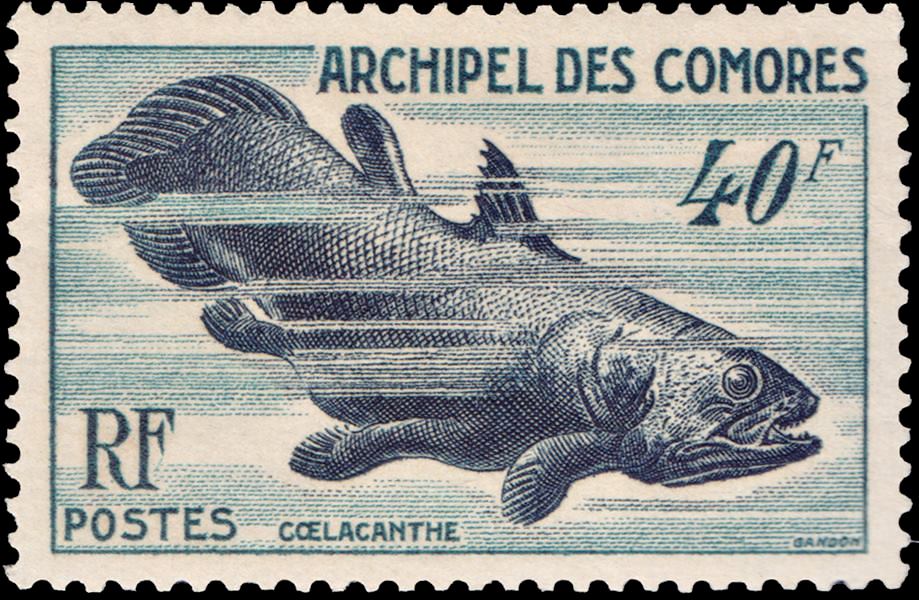 COMORES/SELLOS, 1954 – FAUNA MARINA – PECES – CELACANTOS – YV 13 – 1 VALOR – MINT
