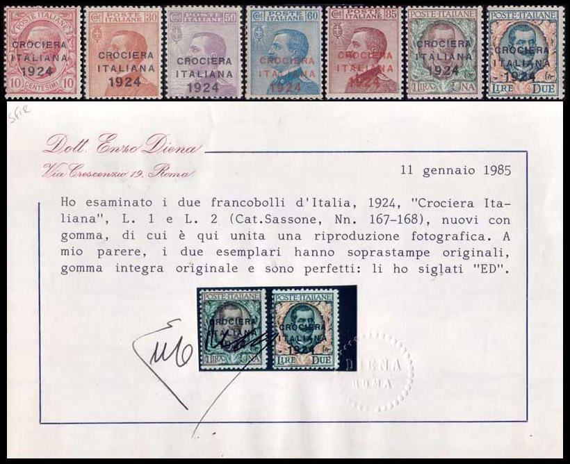 ITALIA/SELLOS, 1924 – CROCIERA ITALIANA 1924 – YV 156/62 + 7 VALORES – CON CERTIFICADO DE LOS 2 VALORES MAS ALTOS – MINT
