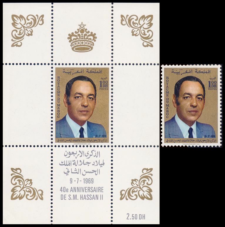 MARRUECOS/SELLOS, 1969 – REY HASSAN II – 40 ANIVERSARIO – YV 588 + BF 5 – 1 VALOR + BLOQUE – MINT