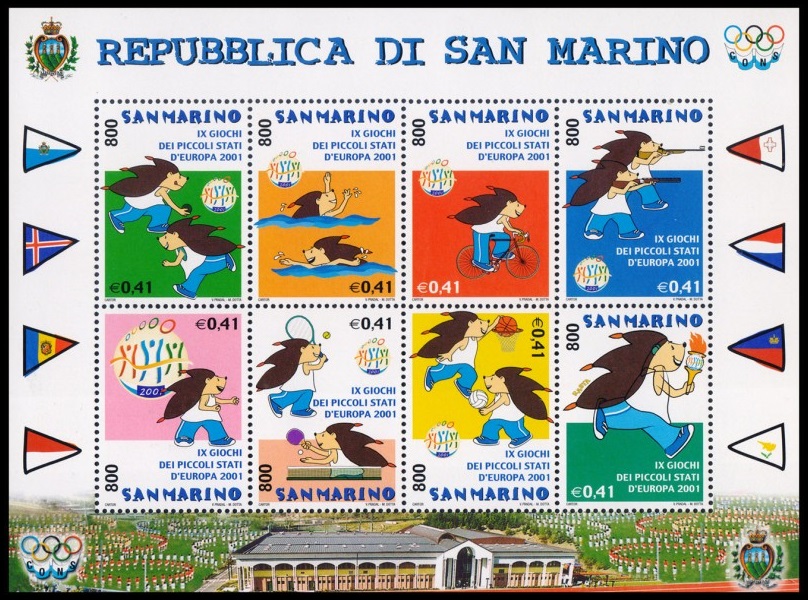 SAN MARINO/SELLOS, 2001 -DEPORTES – XI JUEGOS DE LOS PEQUEÑOS ESTADOS DE EUROPA – YV. 1749/56 – HOJITA – NUEVO
