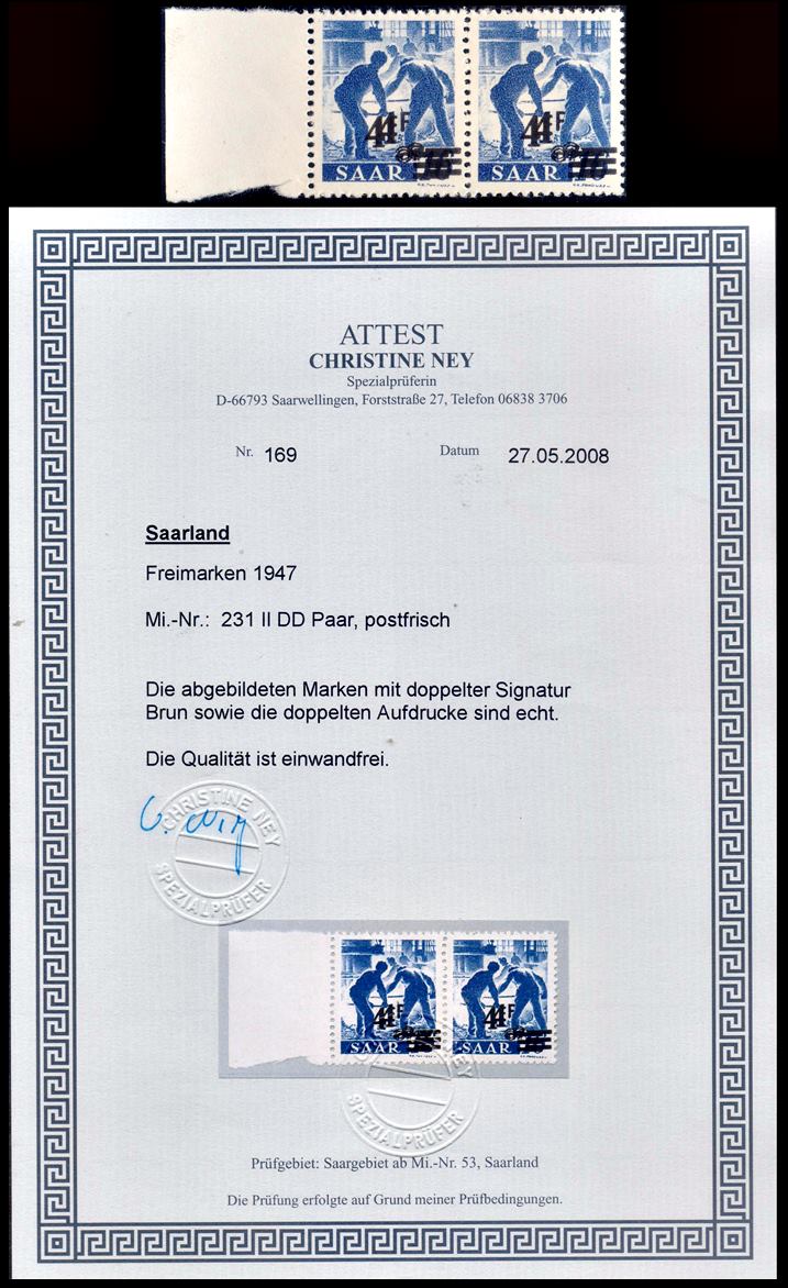 SARRE/SELLOS, 1947 – SELLO CON DOBLE IMPRESION – MICHEL 231 II DD – PAR – CON CERTIFICADO – MINT