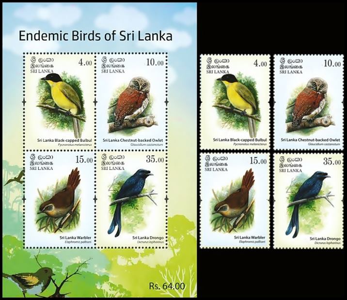 SRI LANKA/SELLOS, 2017 – AVES – ENDEMICAS – YV 2132/35 + BF 163 – 4 VALORES + BLOQUE – NUEVO – MINT