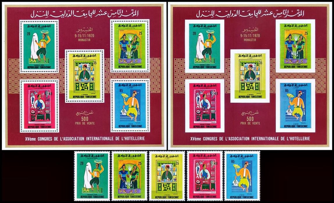 TUNEZ/SELLOS, 1970 – ESCENAS DE LA VIDA TUNECINA – YV 680/84 + BF 3 + BF 3 SIN DENTAR – MINT