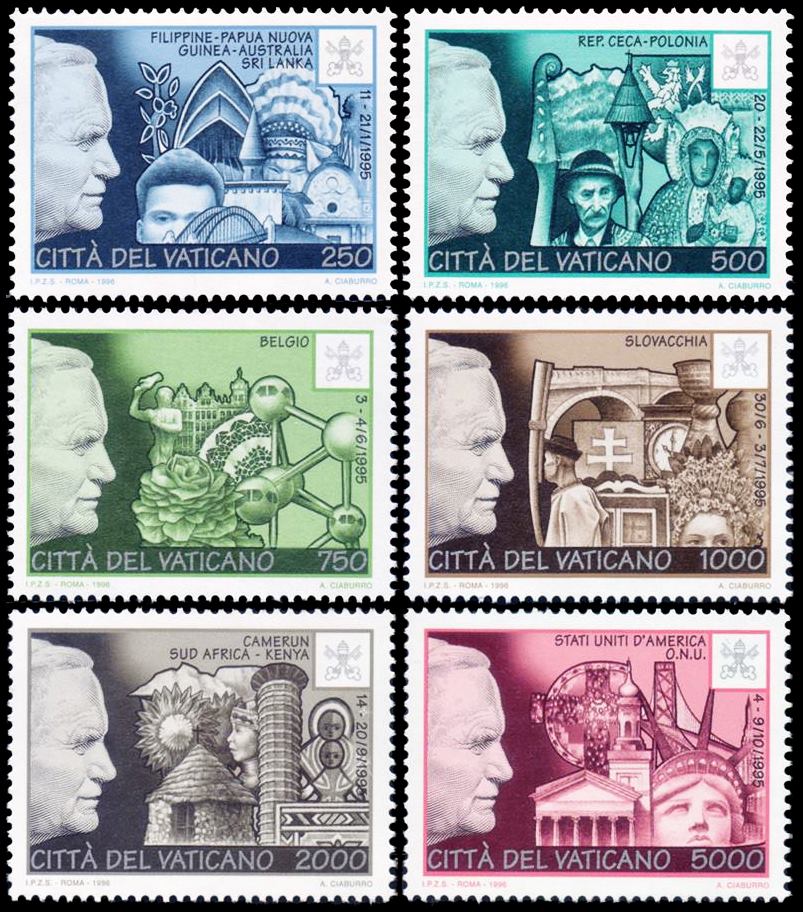 VATICANO/SELLOS, 1996 – SELLOS ORDINAROS – VIAJES DE S.S. JUAN PABLO II POR EL MUNDO – YV 1052/57 – 6 VALORES – MINT