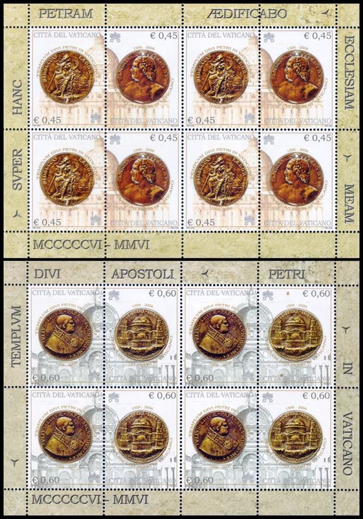 VATICANO/SELLOS, 2006 – 500 AÑOS DE LA RECONSTRUCCION DE LA BASILICA DE SAN PEDRO – MEDALLAS – YV 1409/12 – 2 HOJITAS – MINT