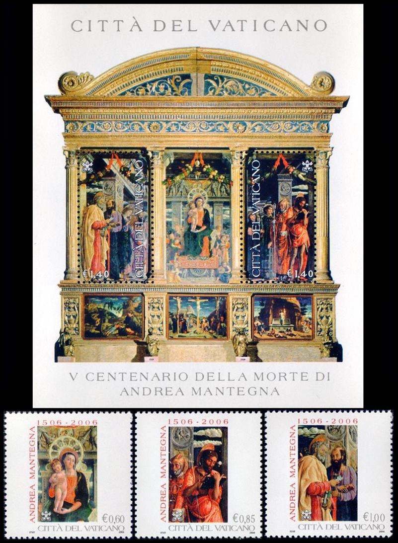 VATICANO/SELLOS, 2006 – ARTE – PINTURAS – ANDREA MANTEGNA – YV 1401/03 + BF 29 – 3 VALORES + BLOQUE – NUEVO – MINT