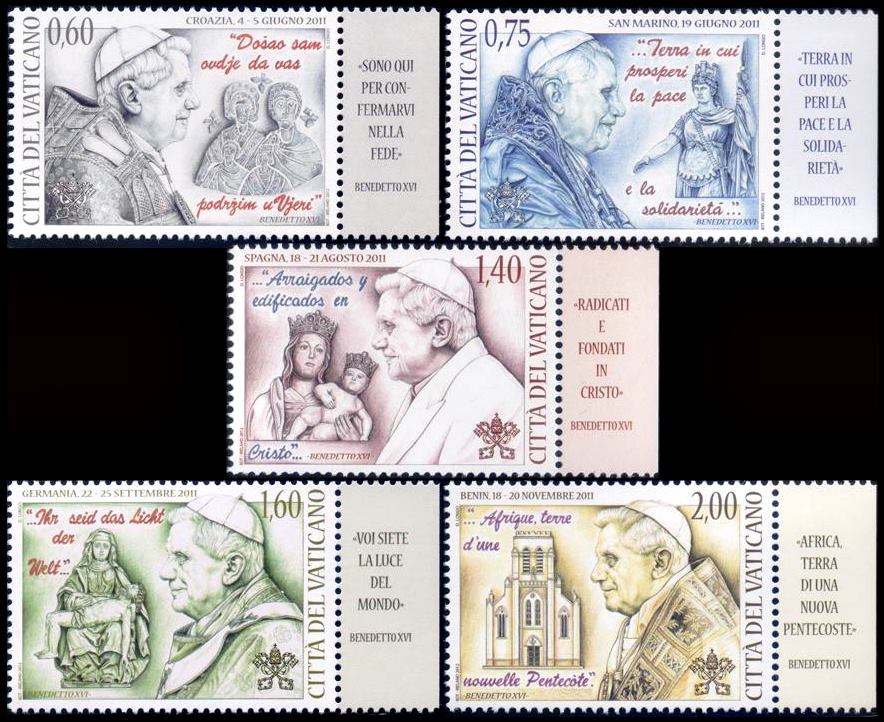 VATICANO/SELLOS, 2012 – VIAJES DEL S.S. BENEDICTO XVI POR EL MUNDO – YV 1601/05 – 5 VALORES – MINT