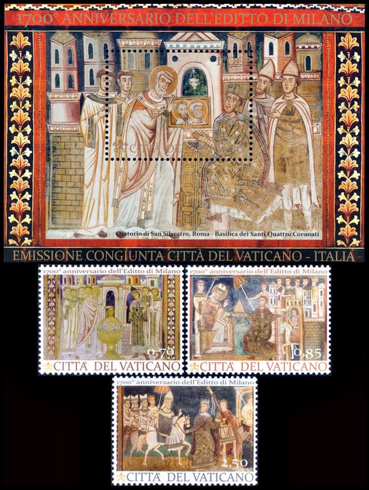 VATICANO/SELLOS, 2013 – 1700 AÑOS DEL EDICTO DE MILAN – FRESCOS – YV 1428/30 + F 1631 – 3 VALORES + BLOQUE – MINT